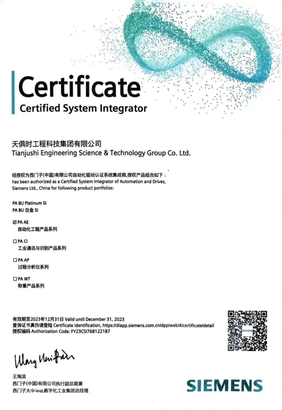 天俱時(shí)集團(tuán)與西門子合作至今已有近二十年的歷程,是西門子過(guò)程自動(dòng)化白金合作伙伴、西門子2022年度最佳技術(shù)賦能合作伙伴。